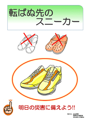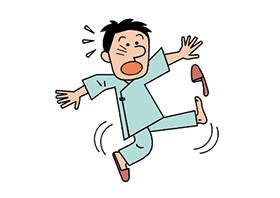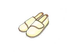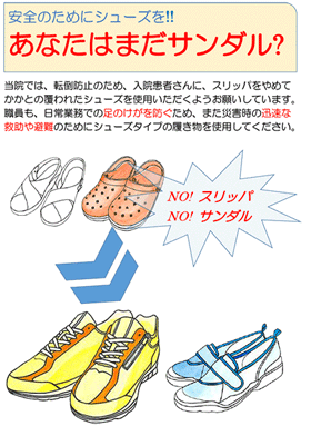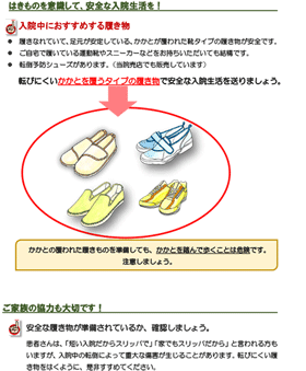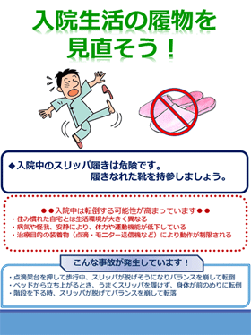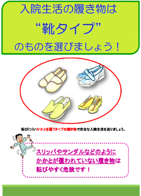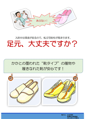 入院中の適切な履き物(はきもの)の選択を促すリーフレットやポスターの案、イラストをご提供します