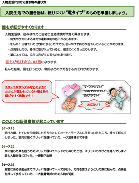 そこで、患者さんに入院中の適切な履き物を選んでもらうための患者説明用リーフレットを作成しました。
