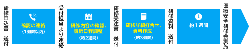 日程調整などいたしますので、お申込は遅くとも、研修実施希望日の2ヶ月前までにお願いいたします。